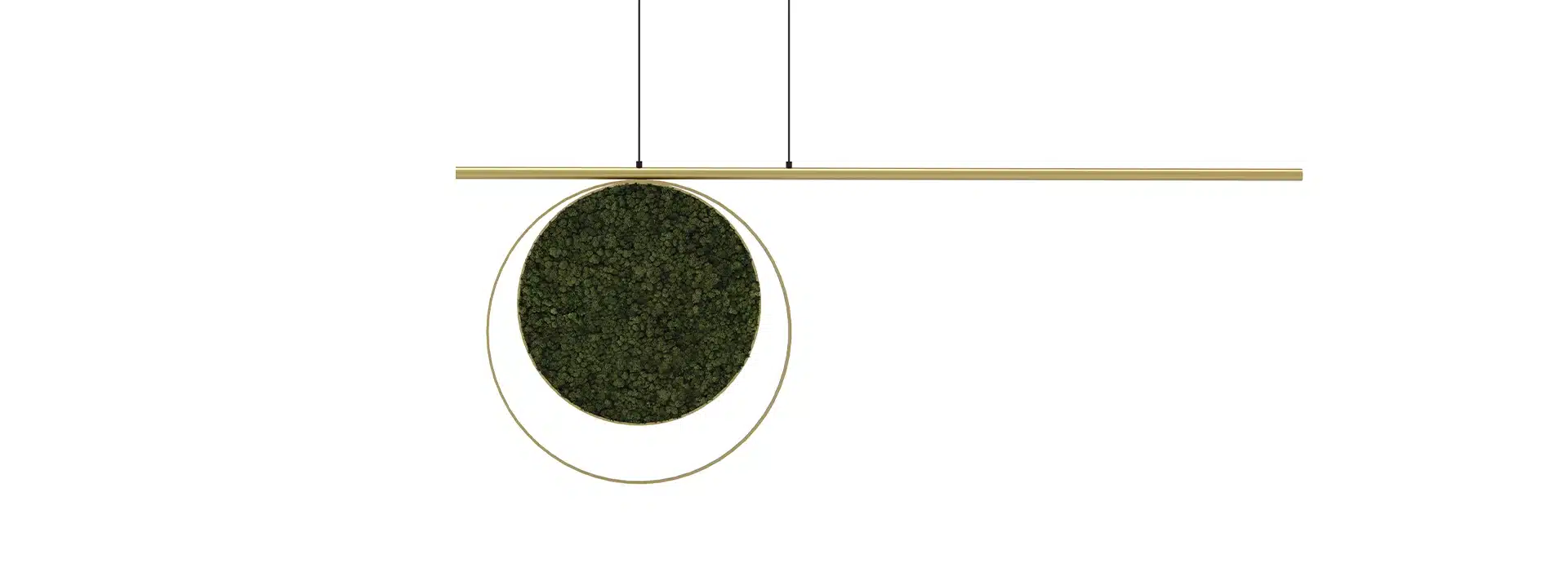Tail ist ein hängendes akustisches Element das einen mit Moos gefüllten Kreis in einen hohlen äußeren Ring einbettet und durch eine minimale Metalllinie verlängert wird. Diese ausgewogene Struktur spielt mit Raum und Orientierung und verwandelt freie Flächen in skulpturale biophile Highlights. Leicht und ausdrucksstark kann Tail einzeln eingesetzt oder in Kompositionen gruppiert werden um eine stärkere visuelle Wirkung zu erzielen.